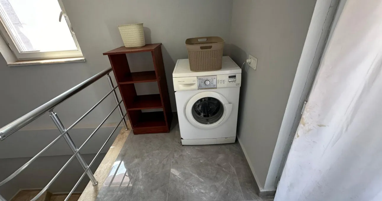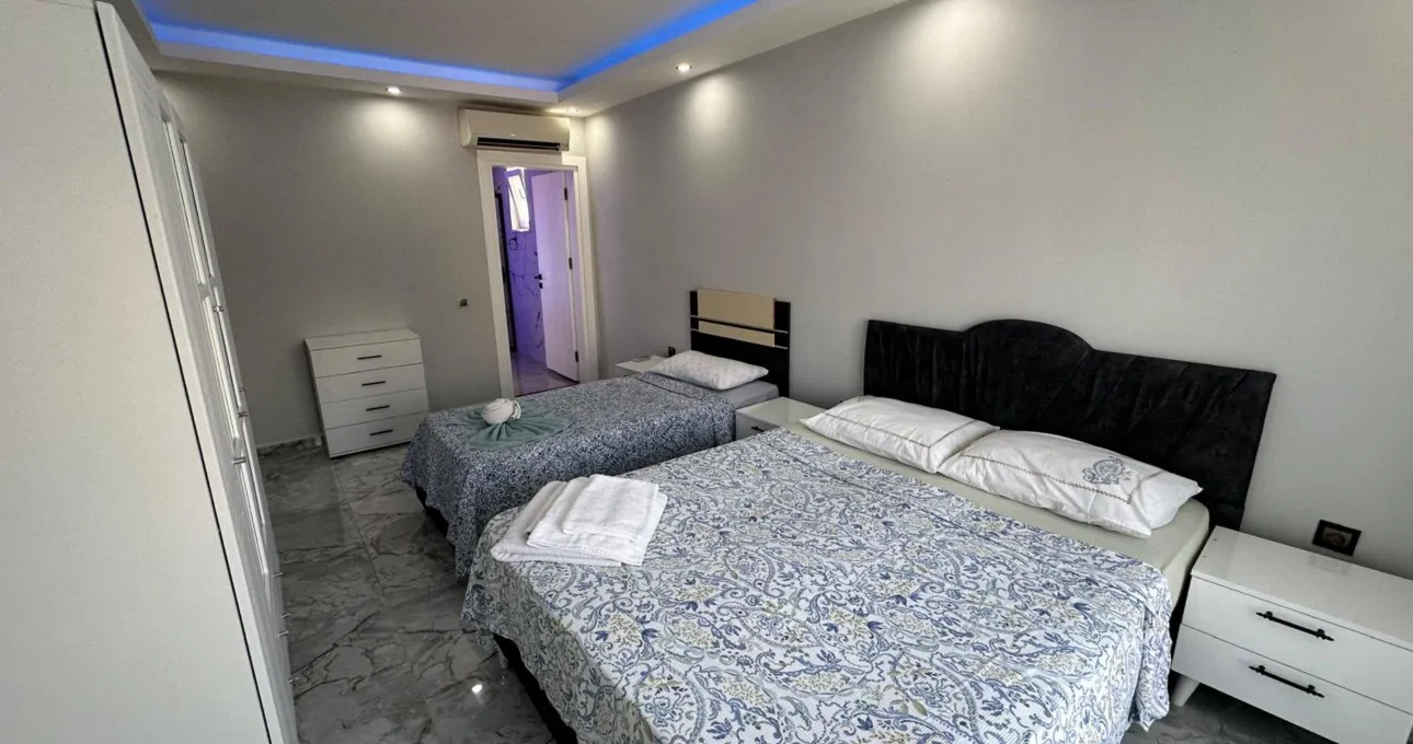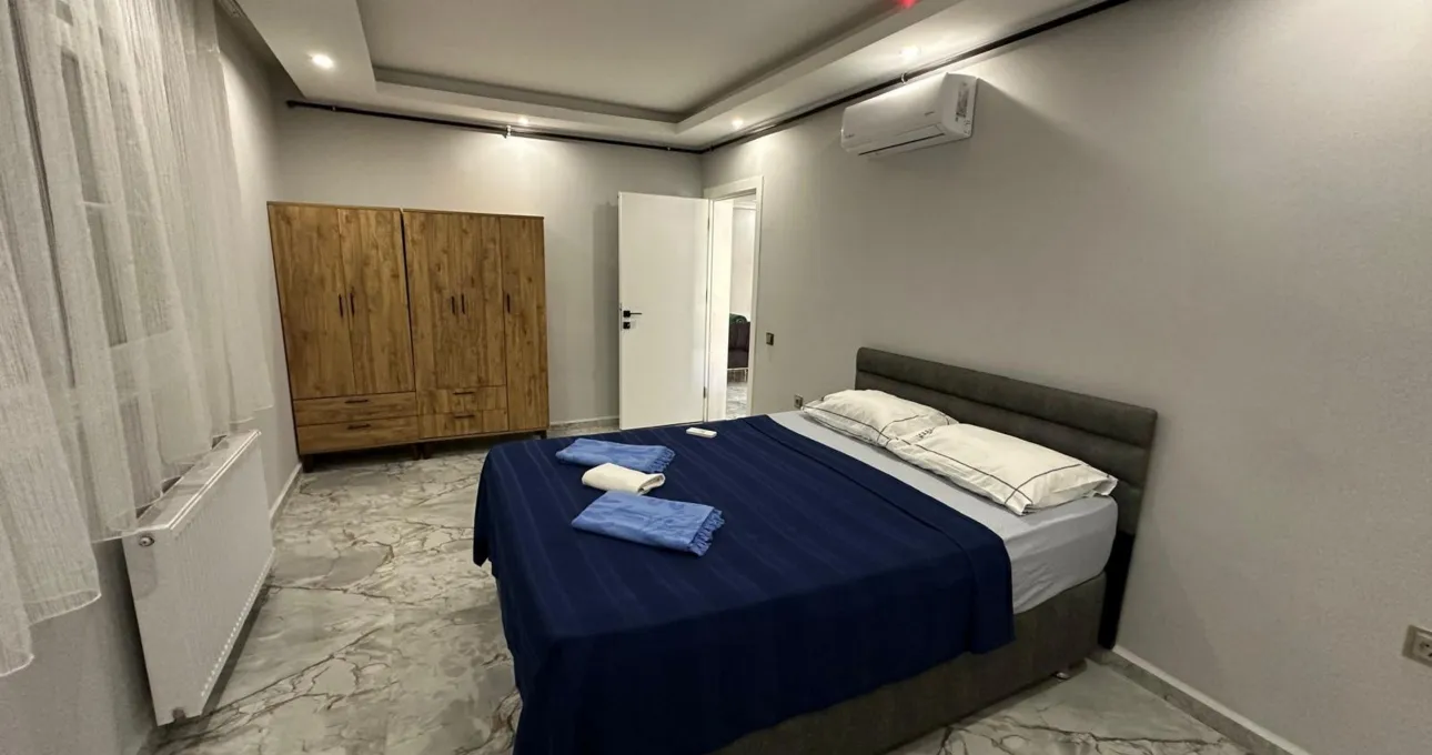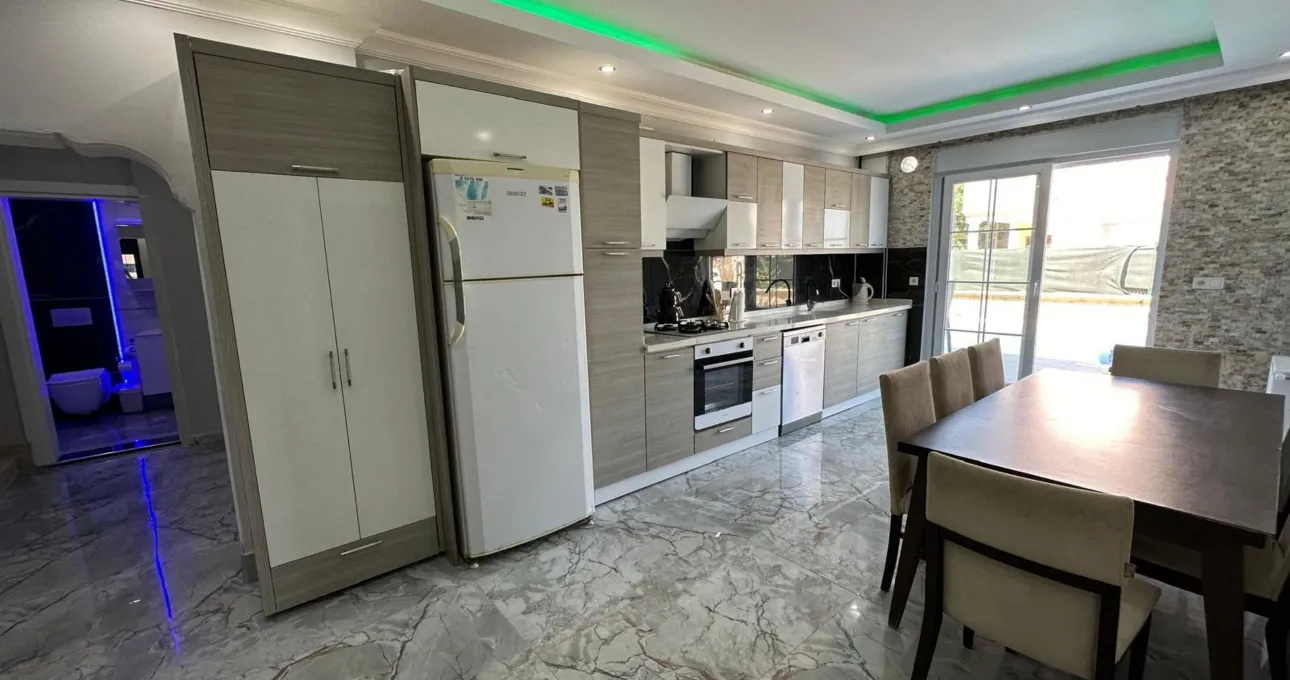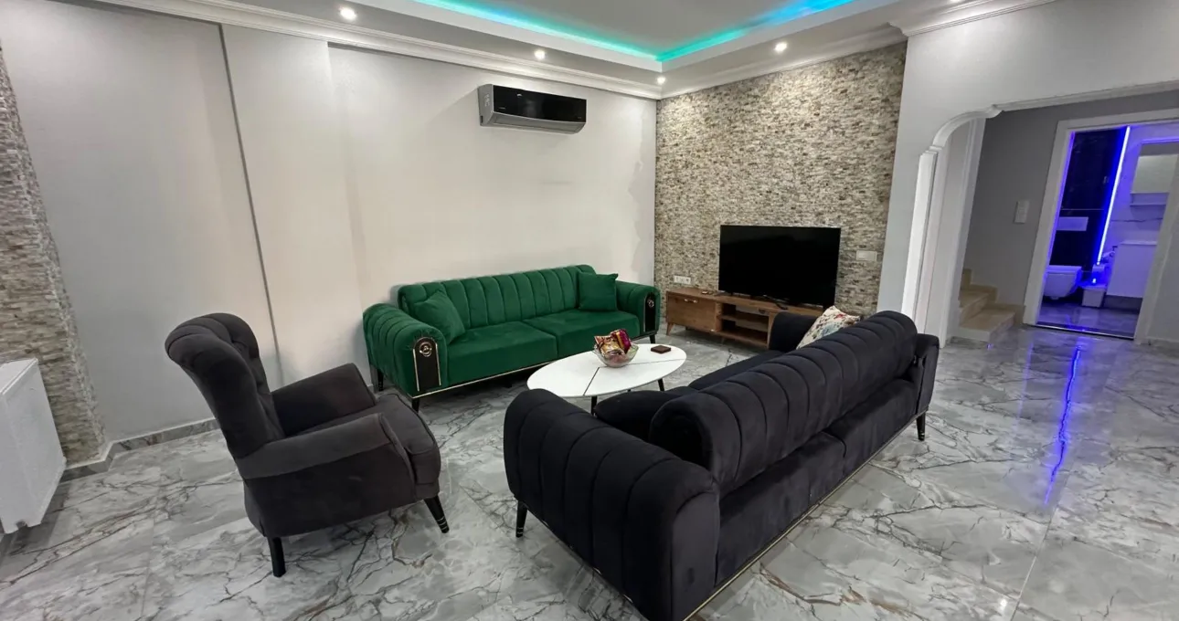 Villanın iç dizaynı, hem estetik hem de kullanım kolaylığı düşünülerek planlanmıştır. Geniş salon, konforlu oturma alanları ve tam donanımlı mutfak sayesinde tatiliniz boyunca ihtiyacınız olan her şeye kolayca ulaşabilirsiniz. Çoklu banyo ve WC yapısı, kalabalık konaklamalarda maksimum konfor sunar.